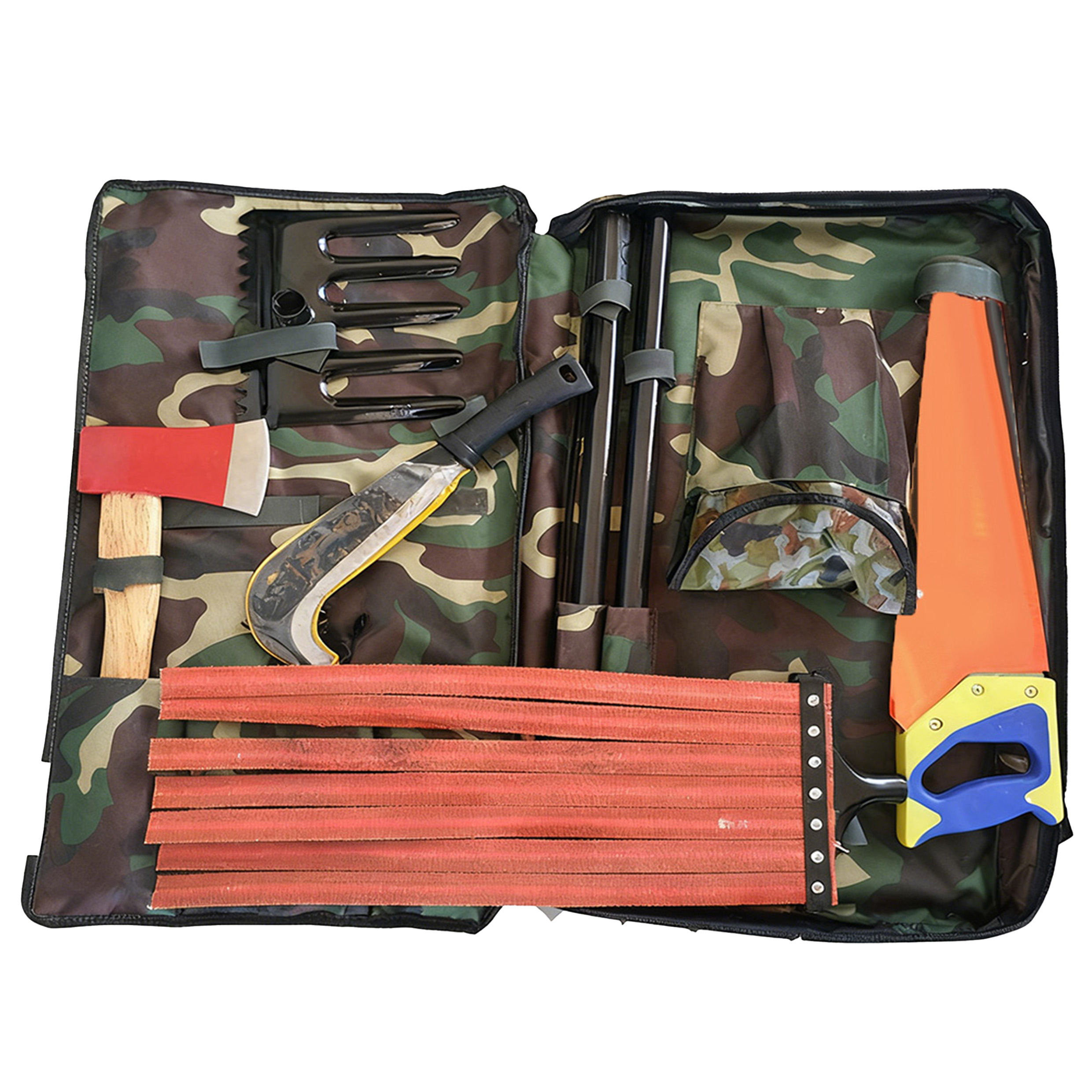 1馑单工具杆采用新型设计,工具包采用涤纶涂层织物,防水性强:2、工具由:砍刀、锯、斧头、锹、扑火拍、五齿耙、连接杆、工具背包共8件组成: