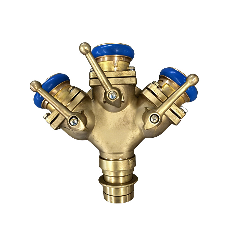 分水器由纯铜铸造而成,有一个进水口,三个出水口,可以随时关闭,控制水流,便于增加和调换支线水带.主要用于铺设消防水带用,是从水带干线分出水带支线的消防器材,他的主要材料为铜合金,由本体阀,接口等组成。工作压力:2.5Mpa,进水口径:80mm,出水口径:3×65mm。
